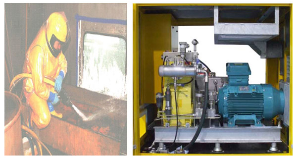 고압분사장비는 고압 분사기를 사용하여 도구, 구성품 및 건물 구조물에 부착된 방사성 오염물질 제거